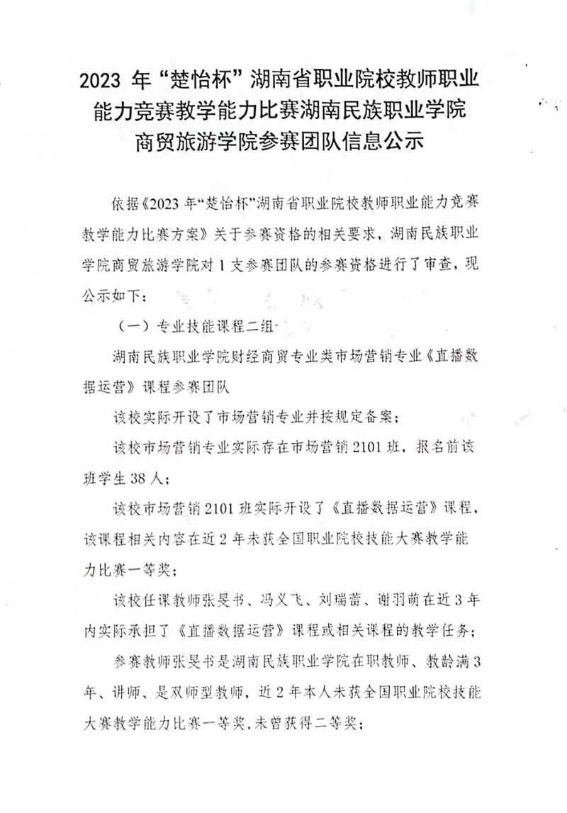 2023年“楚怡杯”湖南省职业院校教师职业 能力竞赛教学能力比赛云顶国际vip.888 云顶国际vip.888参赛团队信息公示